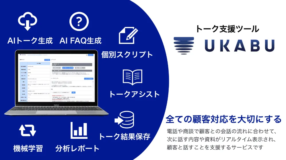 「AIトーク支援ツールUKABU」は、営業やコールスタッフと顧客のコミュニケーションをサポートするツールです。