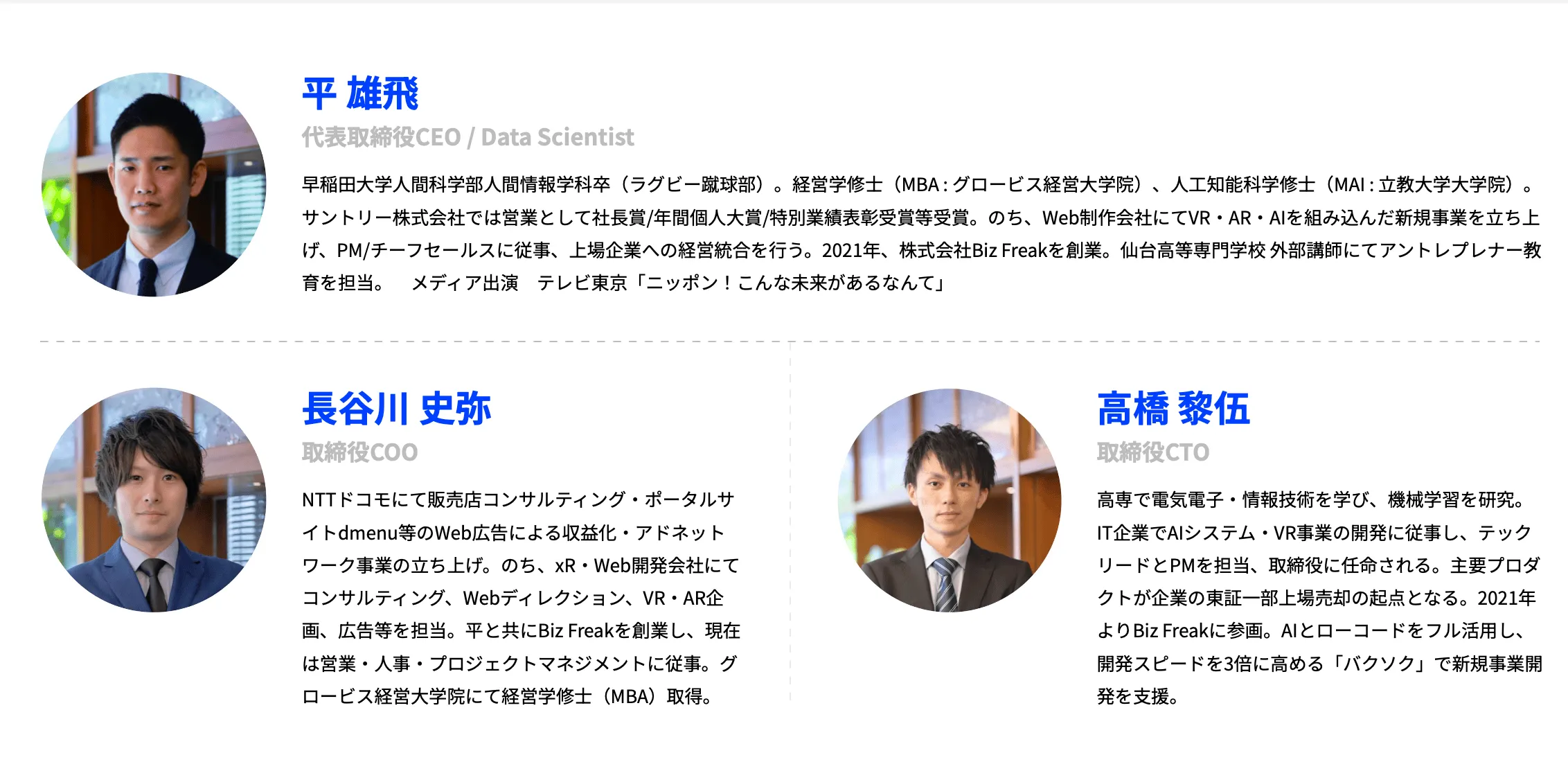 株式会社Biz Freakは、「日本を最高のイノベーション大国にする」というミッションを掲げ、AIやノーコード技術を活用したサービス開発を行っています。私たちは、従来の常識にとらわれず、常に新しい技術に挑戦し続けることで、顧客のビジネス成長に貢献しています。具体的には、AI・最先端ツールを駆使したアジャイル開発の手法を取り入れ、迅速かつ柔軟に対応できる開発プロセスを構築しています。これにより、顧客の多様なニーズに応えながら、高品質なサービスを迅速に提供することが可能です。