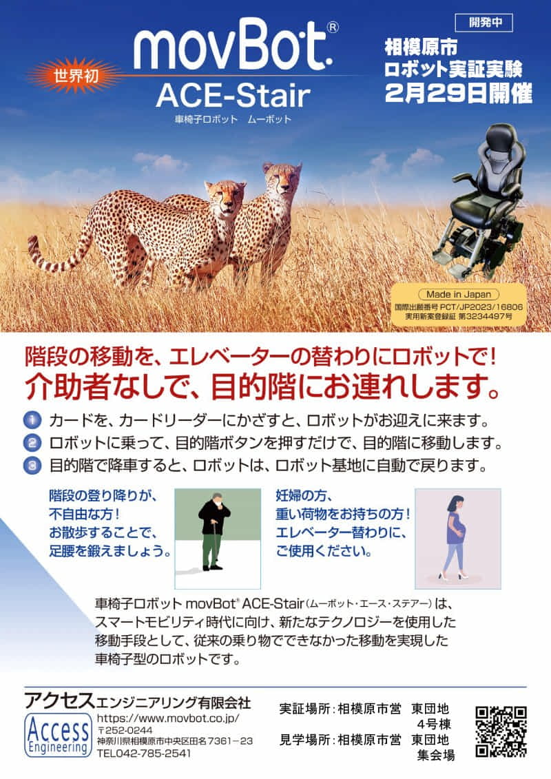 1、国際特許出願中のmovBot®ACEの中で、主に団塊の世代用に建てられた全国25万棟のエレベータのない中層階段住宅で、エレベータの替りに住民がシェアリングで使えるACE-Stairは、管理組合がシェアリングすることで、管理組合も日々の利用料を原資にリース契約で、初期費用なしで、設置でき、住民が安価で利用できることで、階段昇降困難な方、予備軍が日々の出歩きをすることで、寝たきり予備軍の防止にもなります。