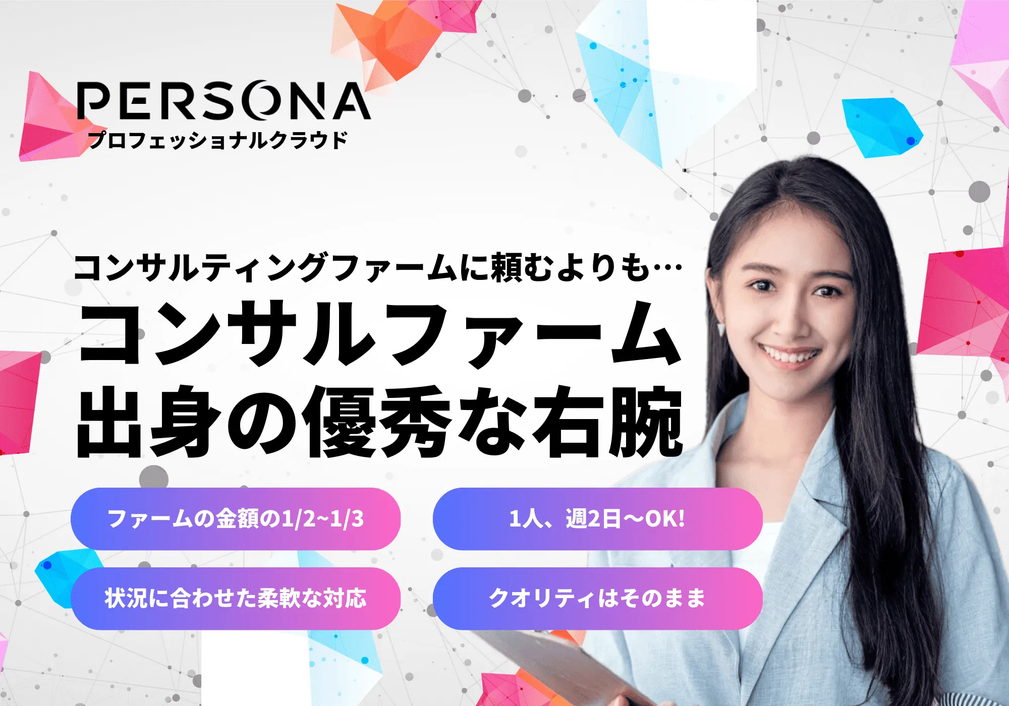 - プロフェッショナルクラウド「PERSONA」は、大手コンサルティングファーム出身者と企業をマッチングするプロフェッショナル人材サービスです。 デロイト トーマツ コンサルティング出身のメンバーを中心に運営されています。また、弊社は日本生命グループのニッセイ・キャピタルより出資を受けて設立されたベンチャー企業です。 「プロジェクトを推進するリーダークラスの人材が足りない」 「コンサルファームに頼むほどの規模ではないし発注金額が高額になってしまう」 「外部人材は質のばらつきがある」 このような外部リソースへの発注を検討したことがある管理職に特におすすめのサービスです。 <特徴> ・ご紹介する人材は大手コンサルティングファーム出身者 ・発注金額は、大手コンサルと比較して1/3~1/2程度 ・0.4人月などの低稼働での発注も可能 ・マッチング担当エージェントは、全員大手コンサルティングファーム出身者のため安心のクオリティ