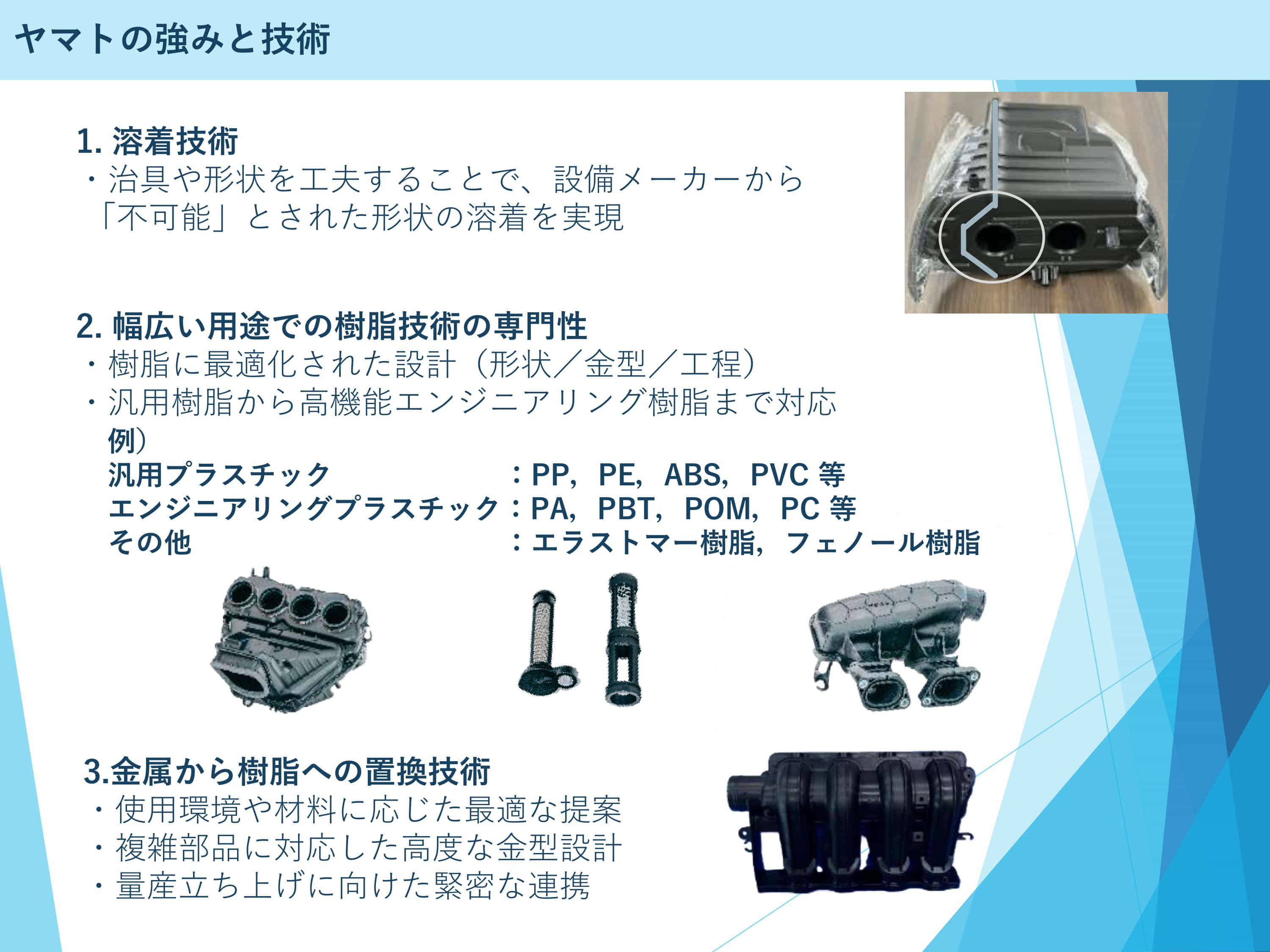 ・モビリティだけでなく、赤外線溶着技術を活用した業務用エアコンフィルターなど、少量・対品種・特殊オーダーに対応できる体制
