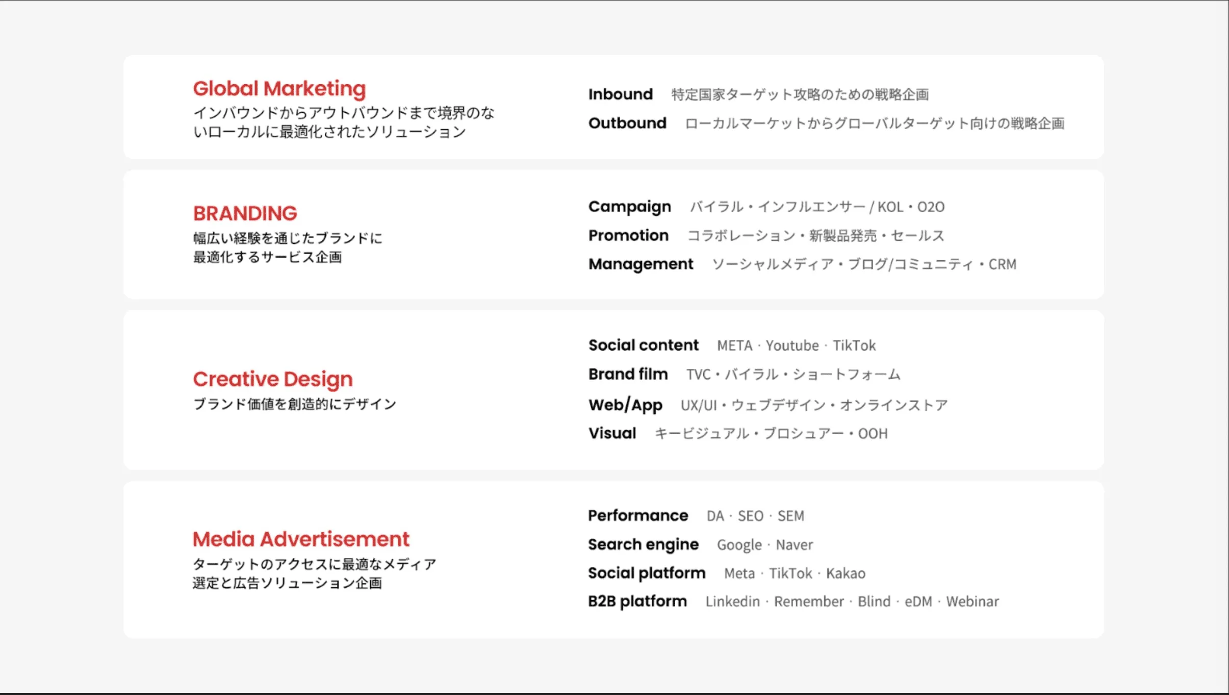 - グローバルマーケティングエージェンシーとして海外企業の日本進出、および日本から海外への進出支援はもちろん国内企業も支援。3年連続で韓国/日本におけるアジアのエージェンシーアワードを受賞。様々な業界のTOPを走る外資企業の支援を続け約15年の歴史をもつ。