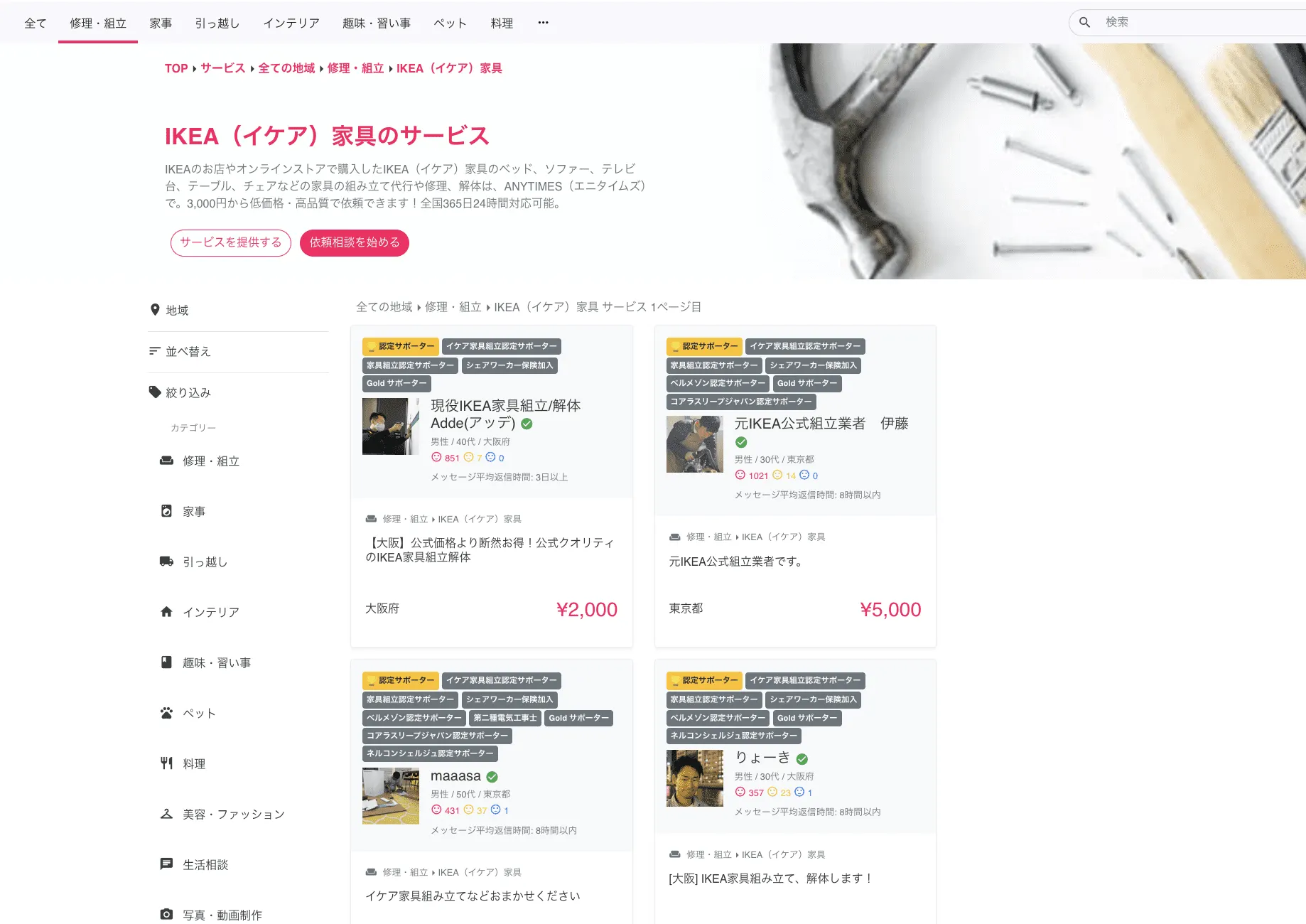 そのため、家具組立に関する仕事に卓越したサポーター(働く側のユーザー)のご登録が著しく、高い技術力を持って、家具組立・解体などのニーズにお応えすることが可能なプラットフォームとなっております。