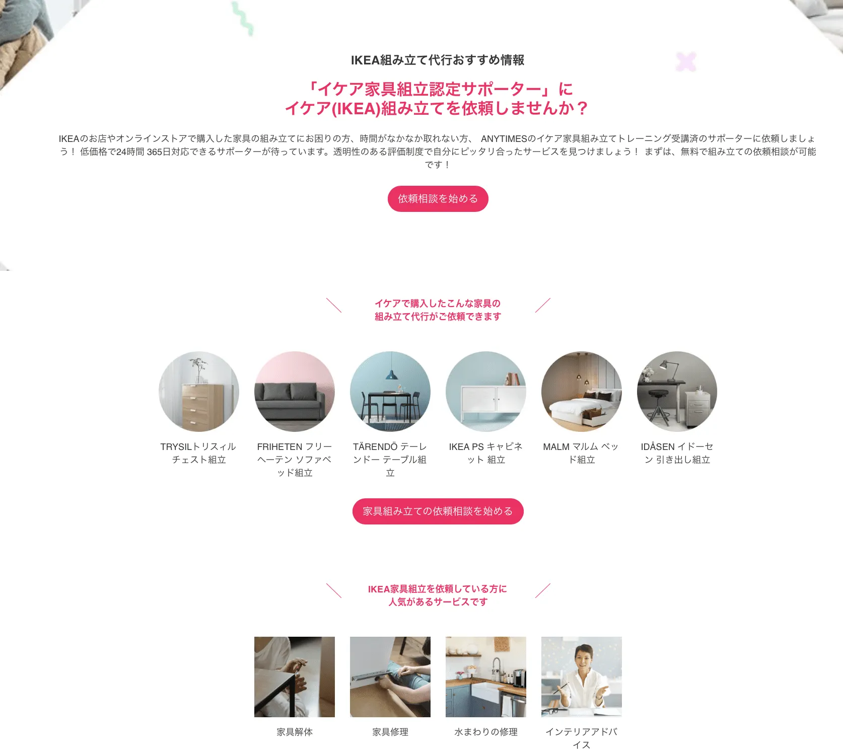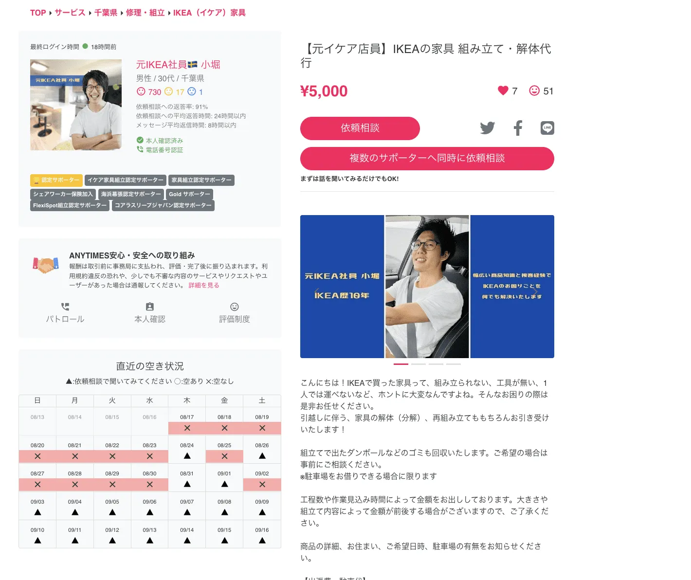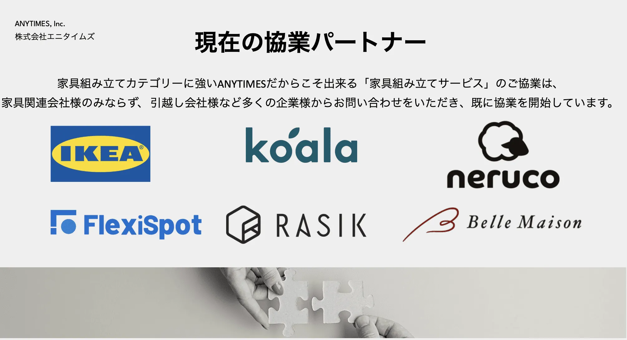 - 弊社は、「ご近所で、会って、助け合い」のコンセプトのもと、家具組み立てや配送、家事代行など、日常のちょっとした用事を依頼したい人と、その依頼に応えて仕事をしたい人をつなぐ、CtoC(個人向け)のスキルシェアプラットフォーム「ANYTIMES」を10年以上にわたり、開発・運営しております。 家具組み立てや家事など、「誰かに頼みたいけれど、頼める人がなかなかいない」というような方は、気軽に依頼をすることができ、逆に、空き時間を有効活用したい、得意なことを生かして仕事をしたい、副業をしてみたいという方は、新しい働き方にチャレンジし、地域貢献をすることができる場所となっております。 従って、かつて日本にもあった、ご近所での助け合い、地域の互助会のような仕組みをオンライン上で実現しております。 2020年12月にイケア・ジャパン様と正式提携をしており、現在は家具の組み立て依頼が全体の85%ほどを占めております。家具組立を必要とする、さまざまな家具メーカー様と協業し、家具メーカーのお客様に対し、付加価値をご提供しております。