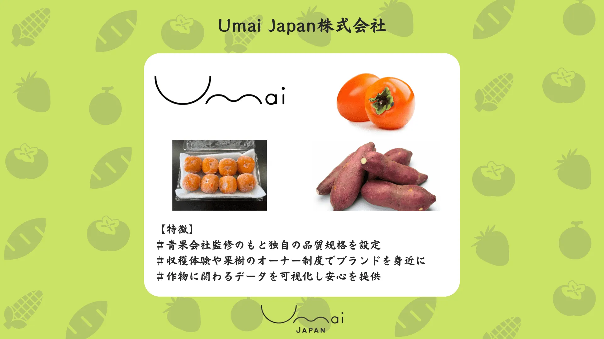 - 日本産農作物ブランド「Umai」の生産から販売までを一気通貫で行い、農産業におけるサプライチェーンの再構築を行うとともに日本産農作物の世界展開を行っております。商品と併せて生産者や生産物、生産地情報などの情報をQRコードで読み取れるようにし、トレーサビリティ面を強化することで、農作物が作られてから手元に届くまでの過程などの「体験」および「安心」を提供します。