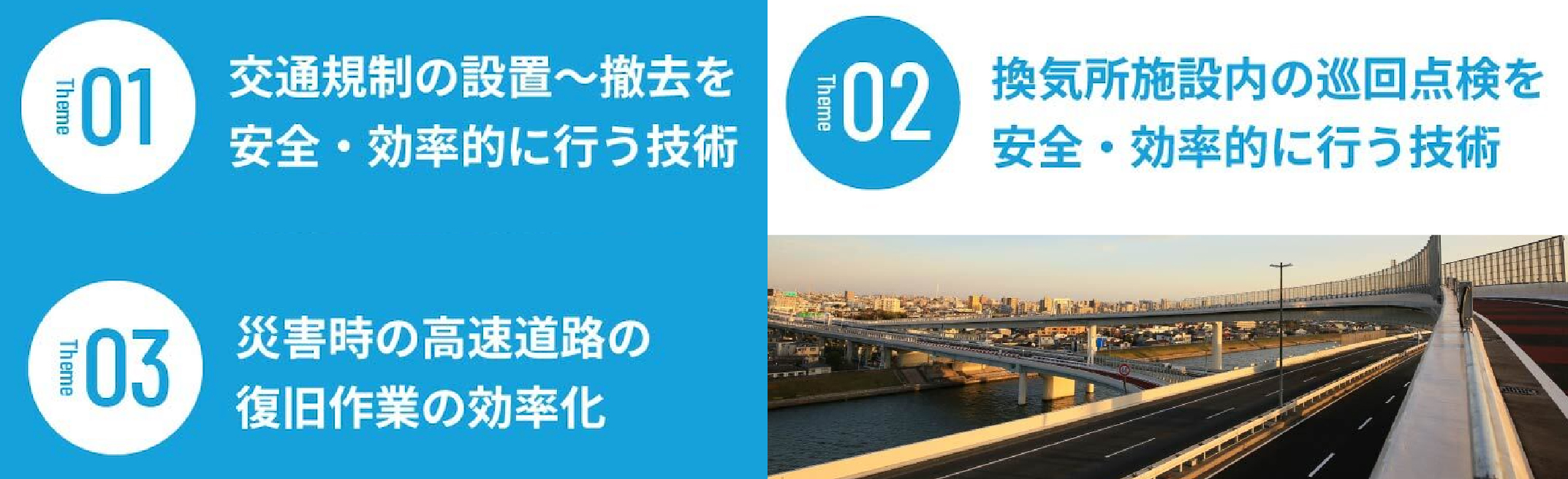 人と物流を支える首都高の安全性をさらに高め、災害や緊急事態に強い社会インフラを実現するため、皆さまの最先端の技術と知見をお待ちしています。