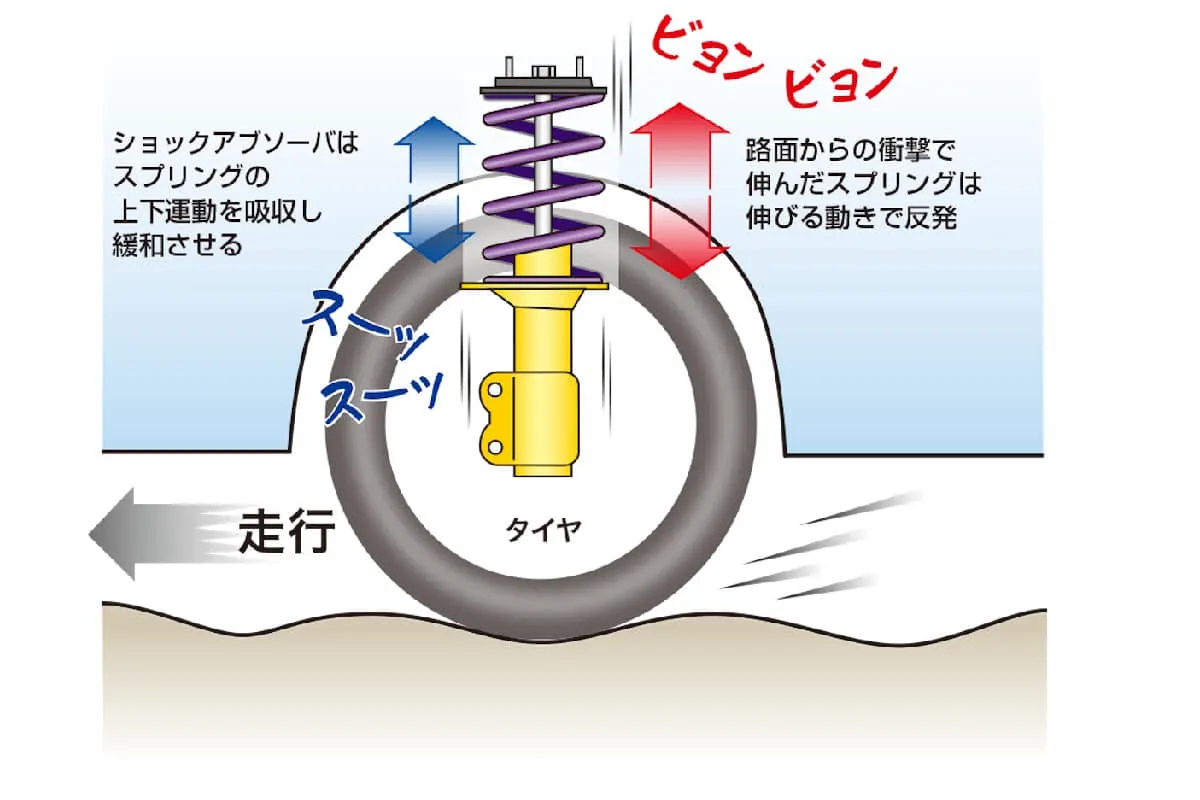 ▲ショックアブソーバは、自動車の余分な揺れを出来るだけ早く抑え、車体を安定させる。(画像出典:カヤバホームページ)