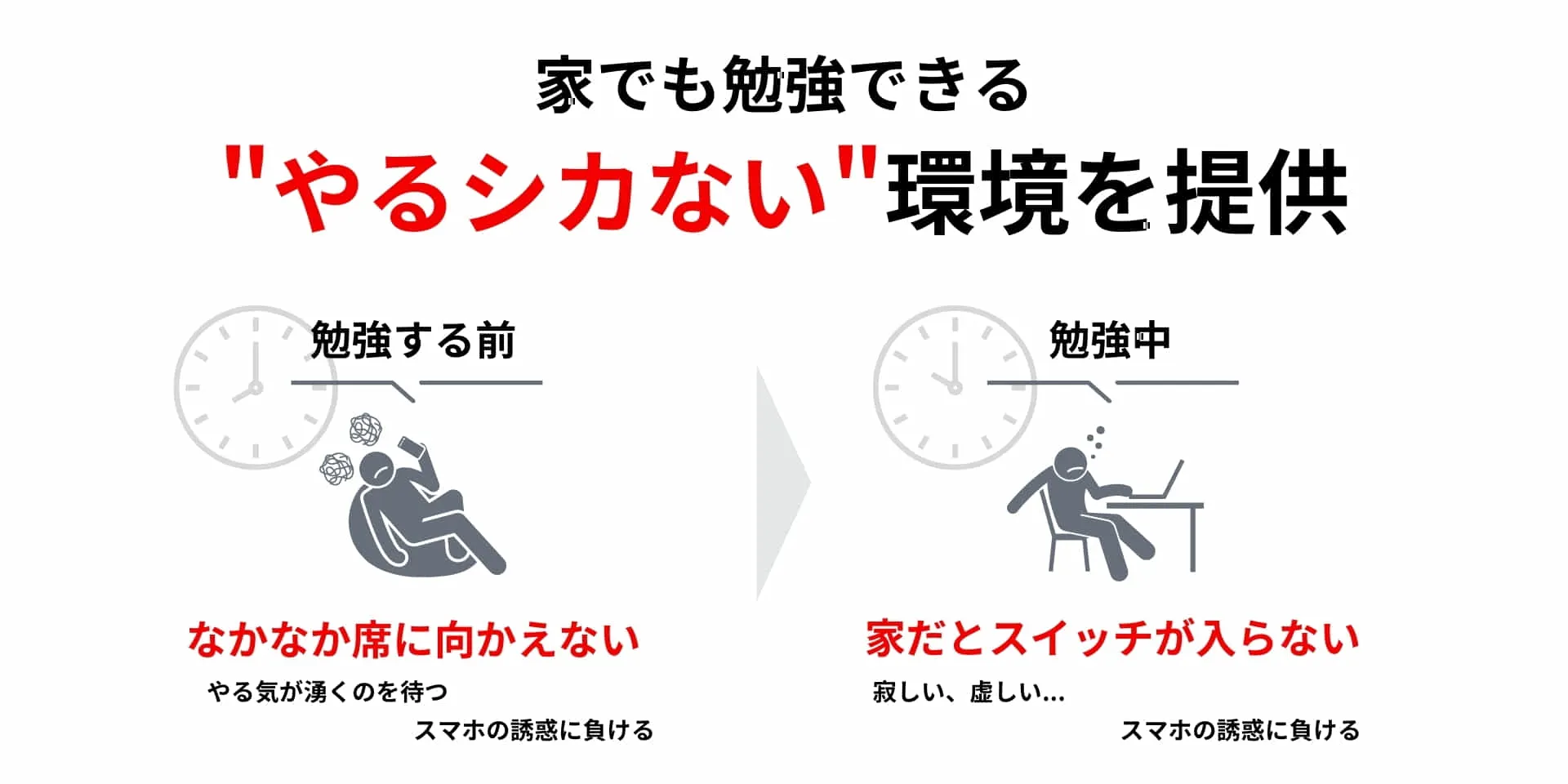 その結果、コントロールできない不自然なやる気に頼るのではなく、”ヤルッキャない環境”によって怠惰性による習慣化の難しさを解決する「やる気を使わないオンライン自習室」の開発に至りました。