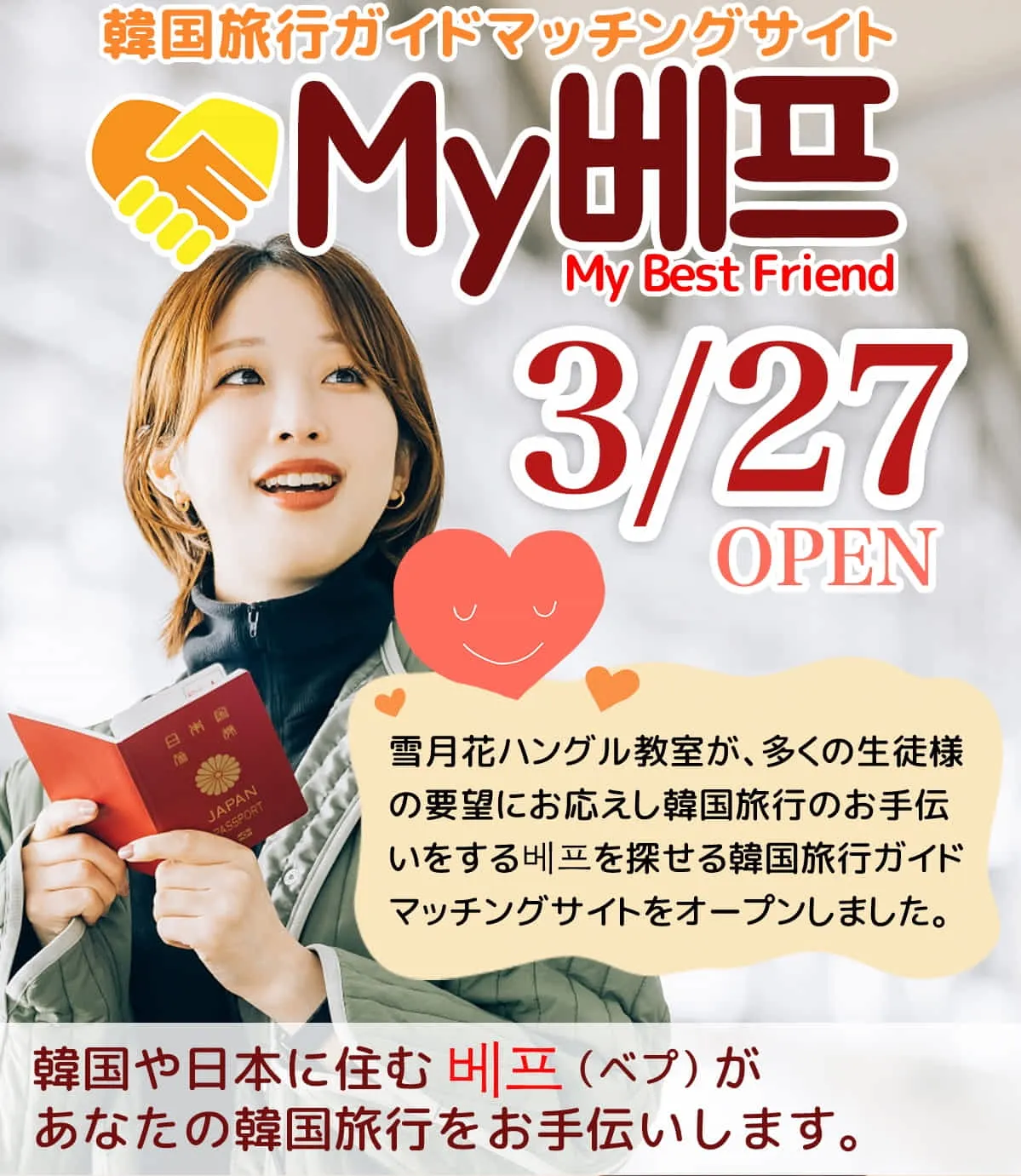 韓国旅行ガイドマッチングサイト My베프(マイベプ)は、日本国内および韓国に在住する韓国語と日本語が堪能な韓国人及び日本人が、韓国旅行に行きたい方の為のお手伝いをするためのマッチングサイトです。