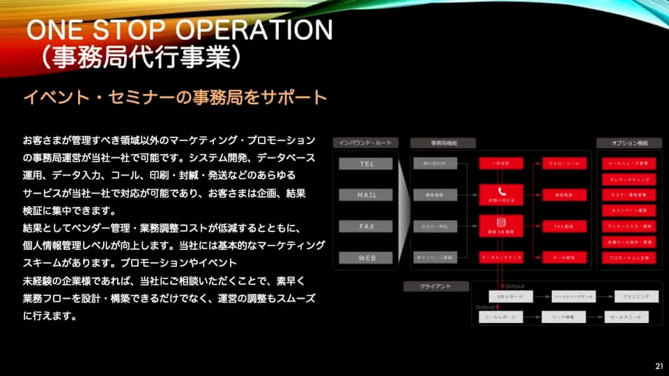 - マーケティングサービスプロバイダー(MSP)事業 企業/事業のマーケティング活動を構築、推進するための人材不足・拡充でお困りの企業様にプロフェッショナルサービス、またマーケティング施策の企画立案・実行などワンストップでアウトソーシングサービスの提供。 マーケティング機能のアウトソース プランニング→オペレーション→クリエイティブ ・ブランディング、プロモーション(WEB・広告制作) ・セミナー/イベント企画運営 ・リードジェネレーション(事務局機能)