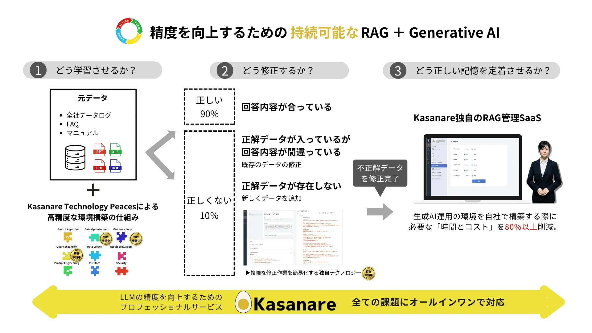 また、「Kasanare Agent Gateway」によって、AIの判断・出力・評価をすべて管理できる仕組みを提供し、LLMの単なる活用にとどまらず、業務構造に適応する“使えるAI”を構築できる技術力を提供します。