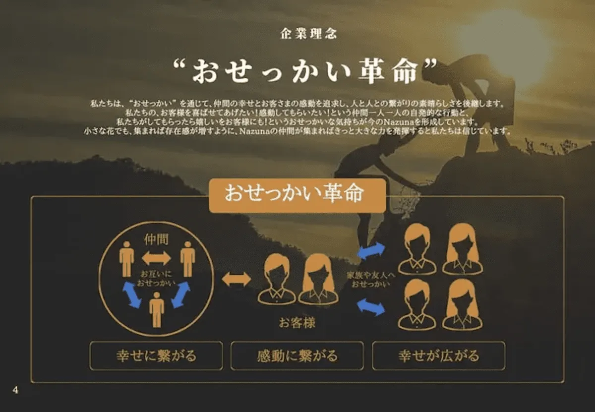 ▲Nazunaでは企業理念として、「おせっかい革命」を掲げている。
