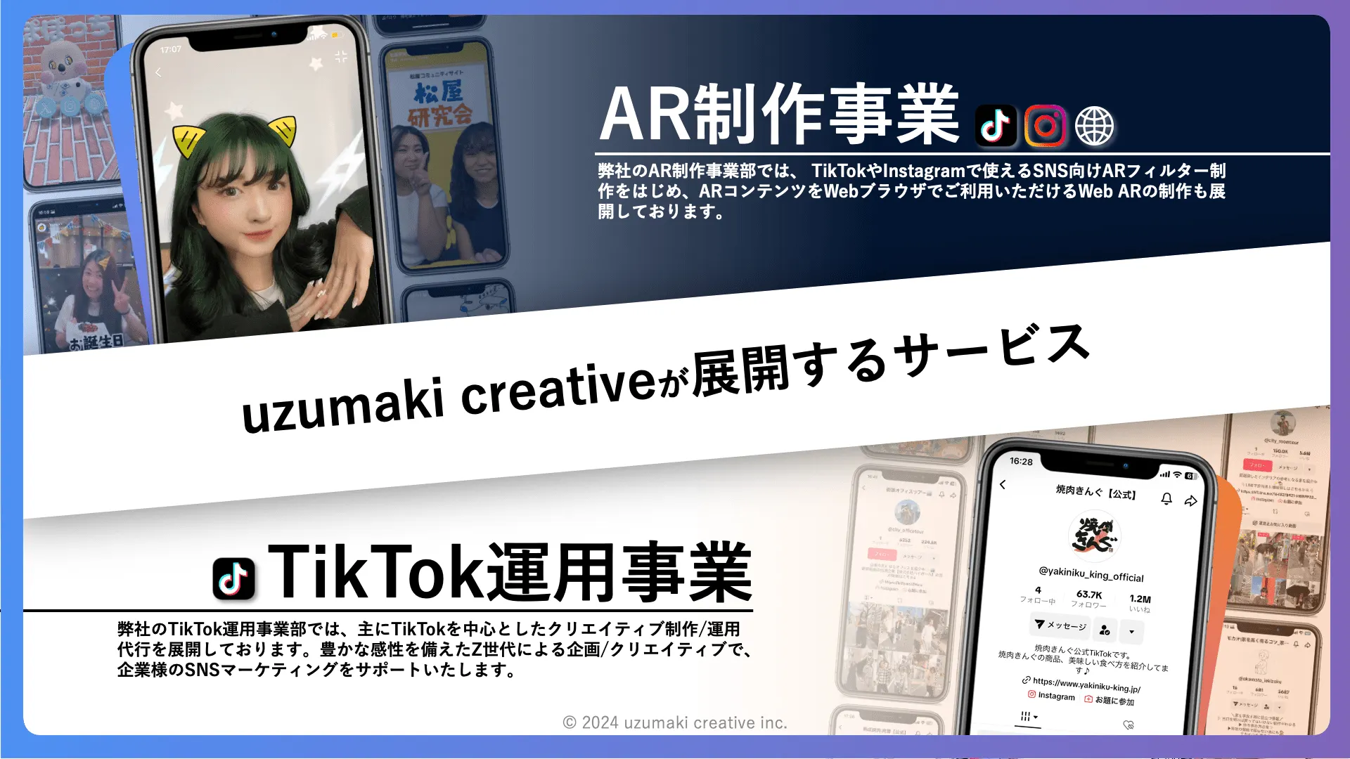 - 企業様のTikTokアカウントを運用代行を行うSNS運用事業、InstagramやTikTok effectで活用できるSNSフィルターの制作を行うAR制作事業で構成されております。