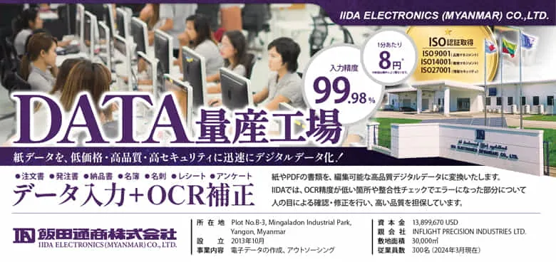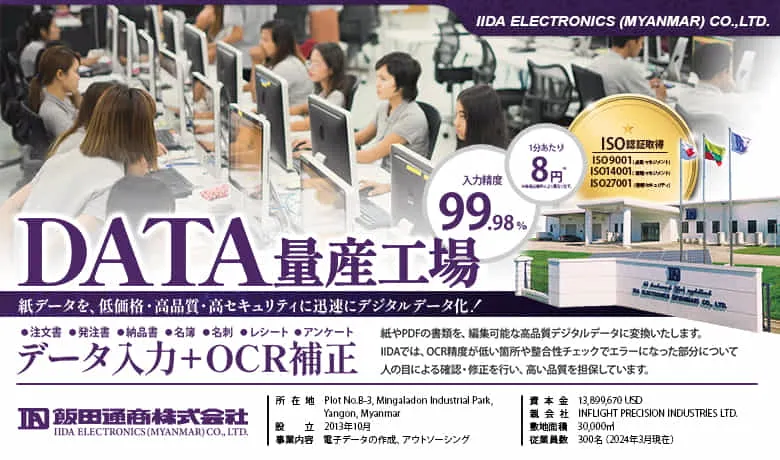 - 飯田通商株式会社の海外生産工場として設立された、BPO事業とEMS事業を行っている会社です。 ミャンマー最大級のBPOセンターを有し、海外のコストメリットと日系企業だから実現できる柔軟対応の両立で「低コスト・高品質」なサービスを日勤/夜勤の2シフト体制にて実現しています。 従来型の専門性の低い単純作業だけではなく、2D・3D CAD/CAM、AI、GIS、BIM等のより専門性の高い業務にも取り組んでいます。