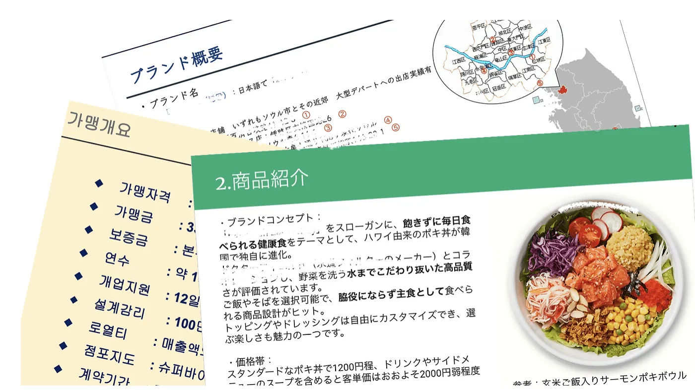 フランチャイズ企業の国際的なマッチング仲介を事業の柱としております。トレンディで成長過程にあるフランチャイズブランド様の多くは、海外事業部を持たないため、海外からのオファーがあっても対応できなかったり、そもそも海外のポテンシャルバイヤーに接触することすら困難です。弊社はそんなニーズを持つ企業様をサポートすることで、どんなに小さなブランドにも挑戦の機会を提供します。2023年の実例では、韓国で5店舗しかないドーナツの名店を、日本の大手飲食企業とマッチングさせ、出店からFC展開までを達成しました。企業間マッチングのみならず、ブランド認知度向上のためのポップアップストア出店代行や、現地ランディングページ制作代行等、包括的なサポート内容を揃えております。