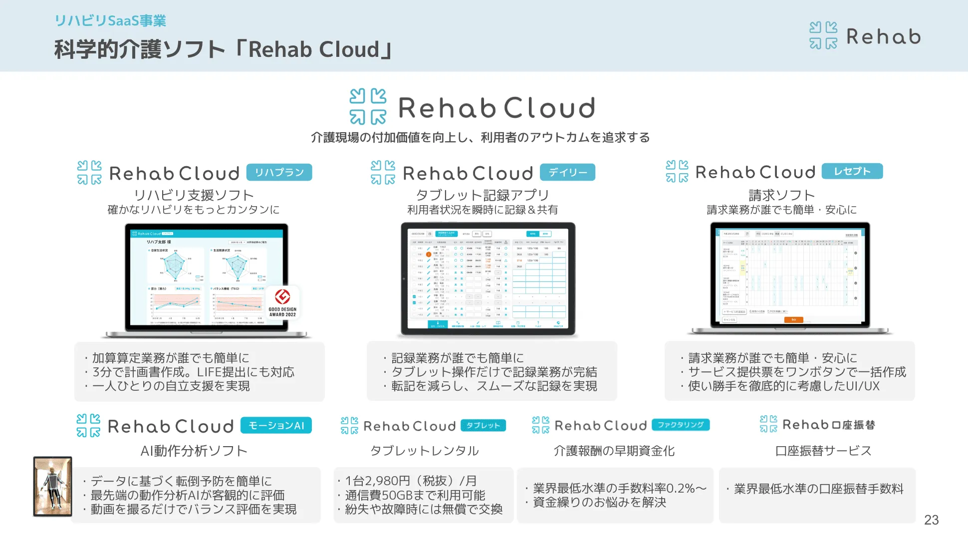 - 科学的介護ソフト「Rehab Cloud」の企画・開発・提供 オンラインリハビリサービス「Rehab Studio」の企画・開発・提供 AI等を用いた介護関連テクノロジーの研究開発