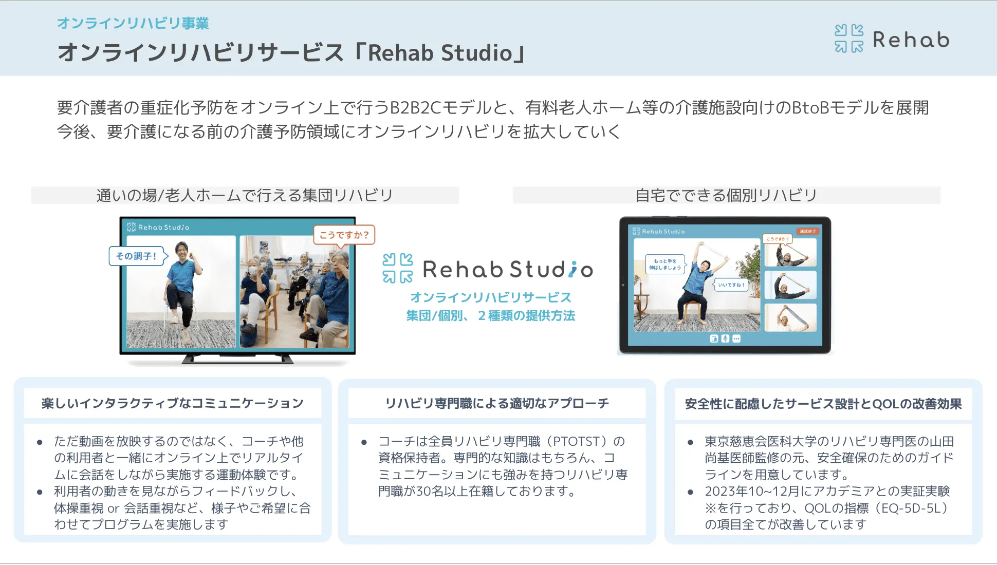 現在、第2の事業として、オンラインリハビリサービス「Rehab Studio」の事業拡大を進めております。