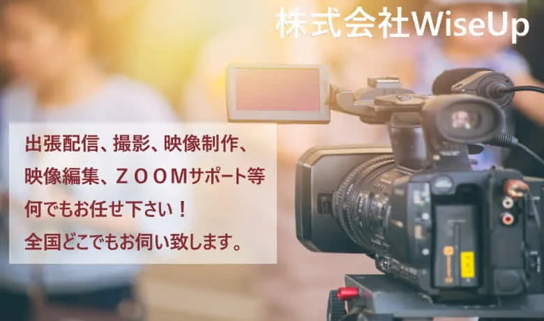 大阪北堀江にクロマキー撮影スタジオを持つ株式会社WiseUpです。 経験豊富な映像スタッフにより安心・安全な映像を提供しております。 全国どこでも出張撮影可能です。 何かと配信するにあたって不安なZOOM配信などもオンラインのみでも配信サポートも行っております。 医療系などの学会や、株主総会、入社式等のオンライン配信(ZOOM、YouTube、Teams等)、 病院紹介や、テレビCM、企業PV動画など様々な動画制作、動画編集も致しております。 是非お気軽にお問い合わせください。