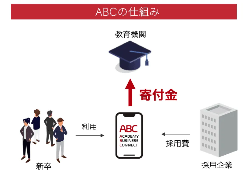 - 日本初のファンドレイジング型新卒採用(就職支援)サービス「ABC」を運営。ABCは事業収益を人材を育成し輩出する高等教育機関へ循環させることを目的としてサービスを設計しています。これにより外部資金(寄付金/奨学金/研究資金)を大学や専門学校およびその他高等教育機関へ持続的に供給します。
