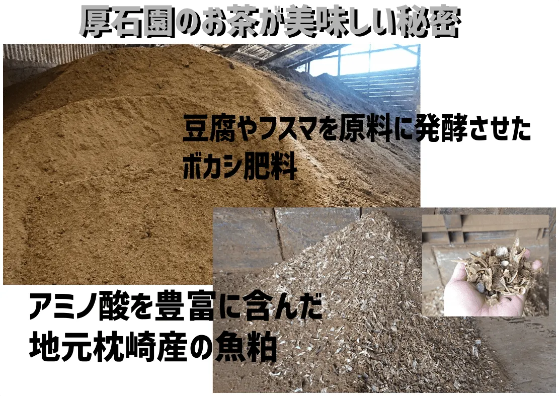 魚粕(鹿児島県枕崎産)、ぼかし肥料(豆腐かす、米糠など)、混合有機質肥料(豚血ペイなど)