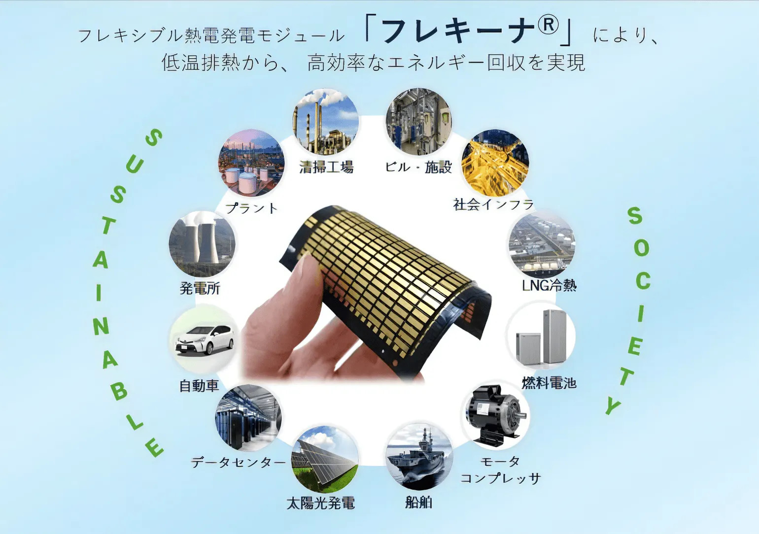 独自の熱電発電技術で 環境中に排出される低温排熱を高効率に電気エネルギーに変えることにより 持続可能な社会の構築を目指す