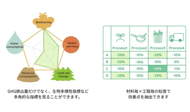 脱炭素だけでなく、生物多様性、水資源利用など多角的な面から商品の現状を計測。