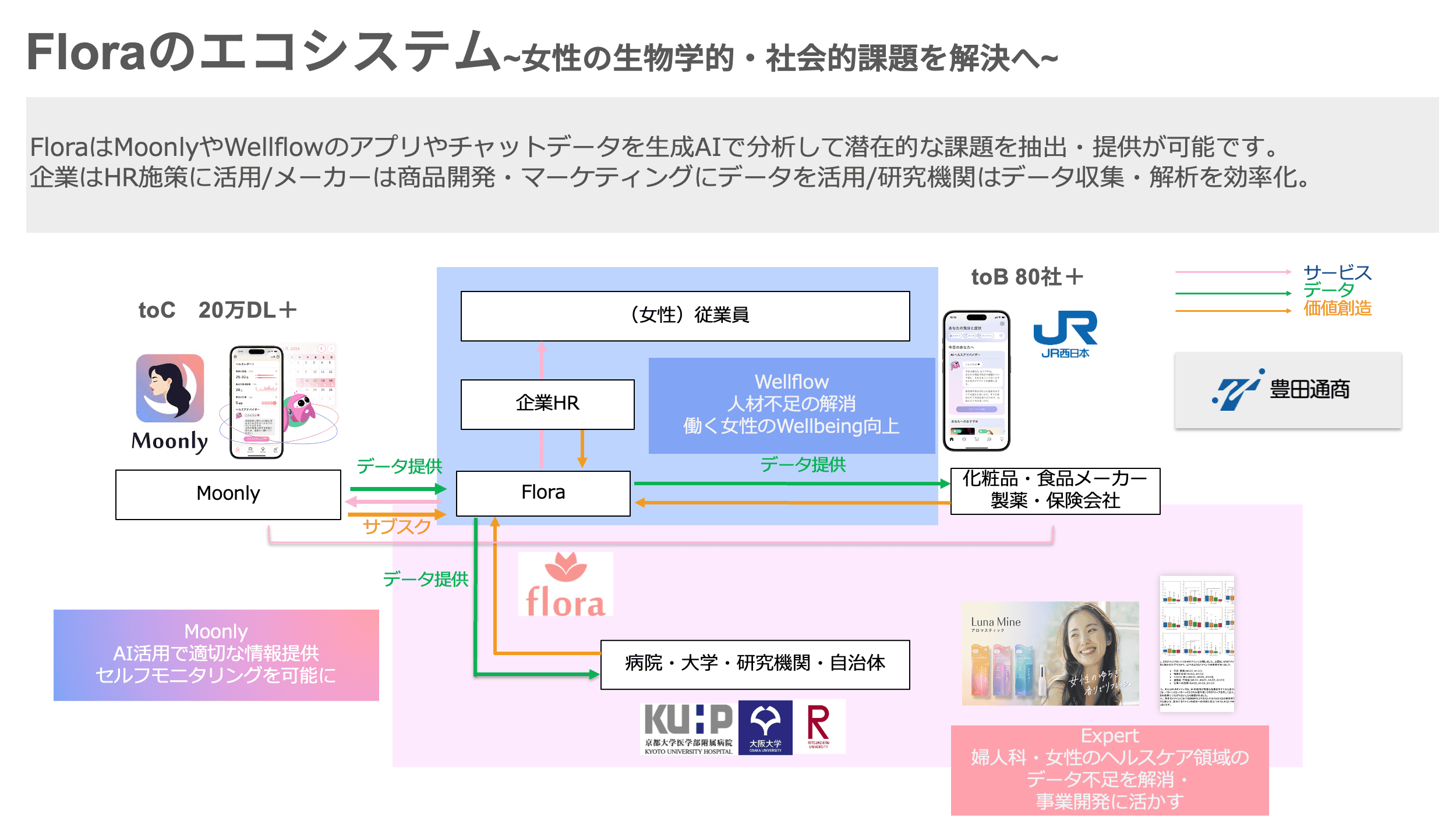 MoonlyやWellflowで蓄積されたヘルスケアデータをもとに、企業と共に商品開発を行い、ユーザーに還元するエコシステムを構築しています。