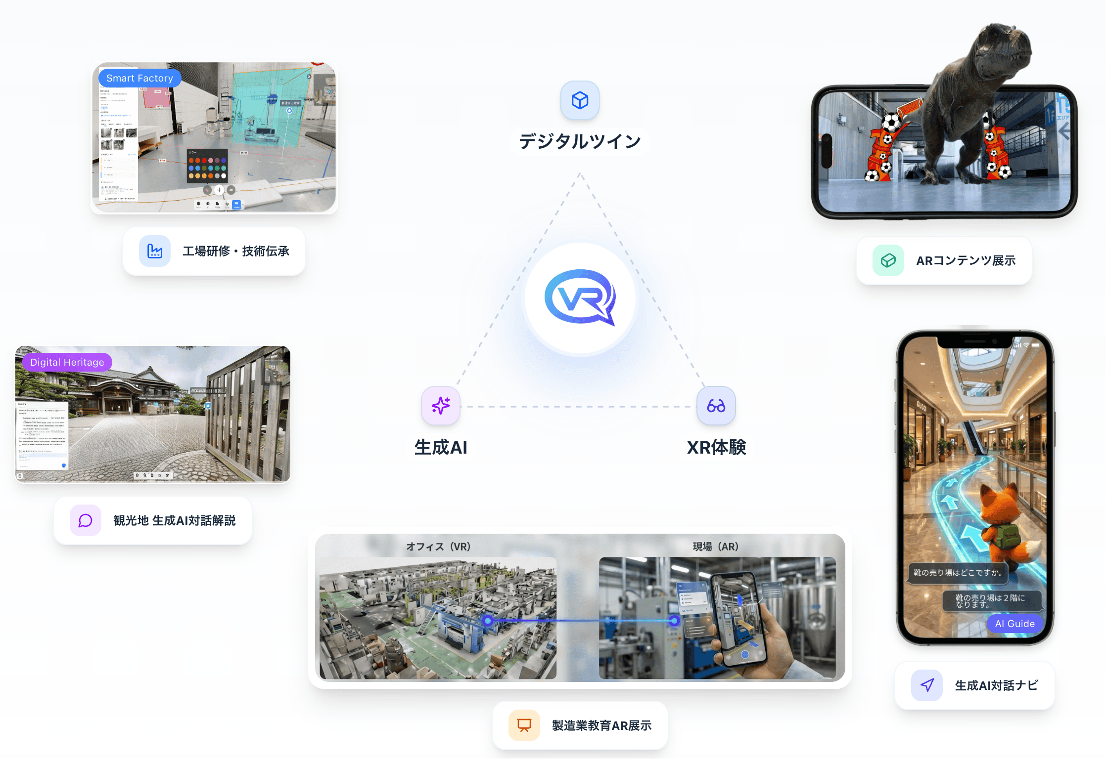 VRTalkは、XR(VR・AR・MR)技術と生成AIを融合し、業界特化型ソリューションを通じて企業や地域のDX(デジタルトランスフォーメーション)を加速するプラットフォームを提供しています。