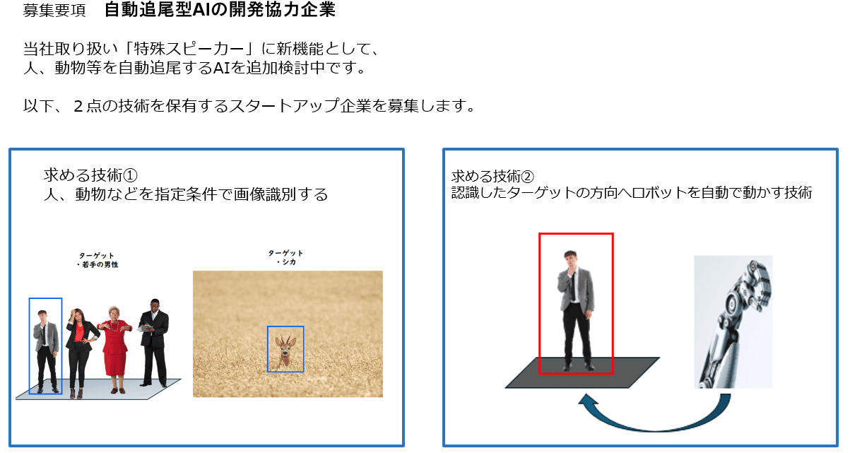 当社取り扱い「特殊スピーカー」に新機能として、人、動物等を自動追尾するAIを追加検討中