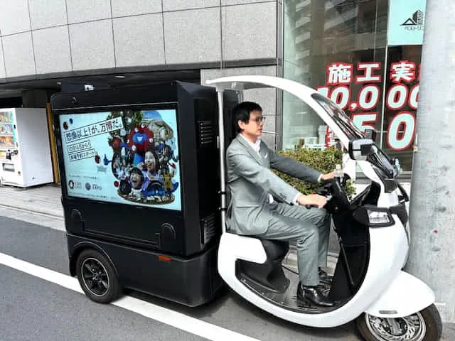 (電動3輪の後部にサイネージと太陽光パネル・蓄電池を設置した新型移動型広告ビークル)