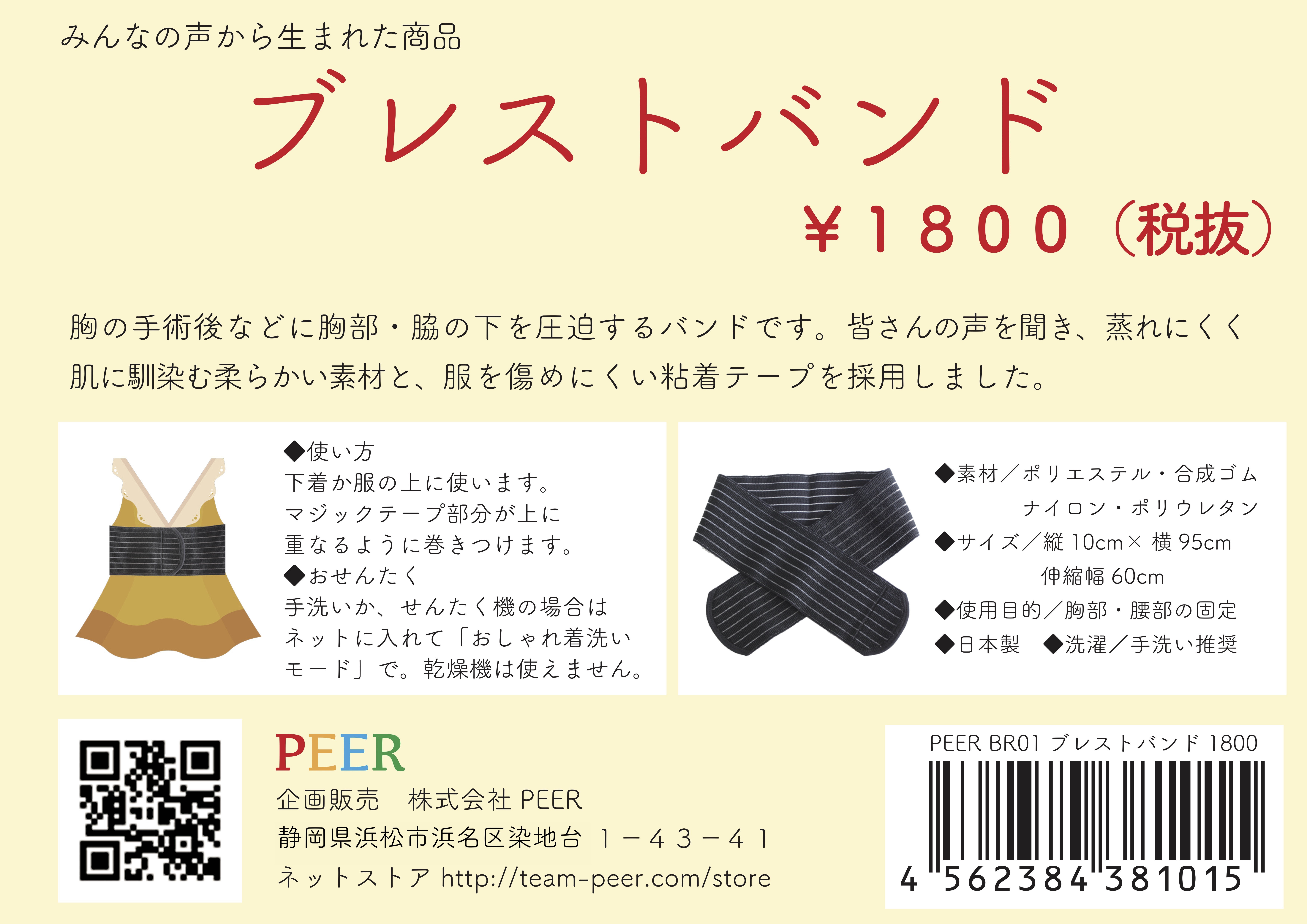 乳腺外科医と手術時に自費で使用するブレストバンドを開発し販売しています。自店舗とオンラインショップのほか、シダックス様、ワタキューセイモア様、株式会社東栄医療器商会様の運営する病院の売店にも卸販売しています。 商品URL https://peer.shop-pro.jp/?pid=103166881