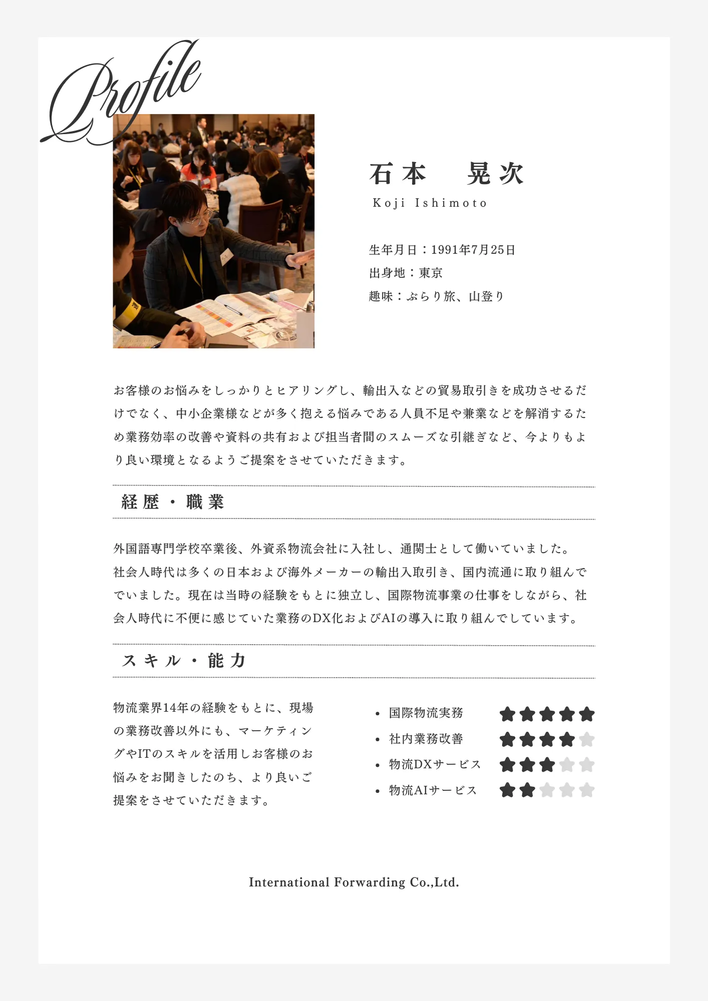 代表が外資系船会社で、通関士としてだけでなく社内物流業務全般を管轄する物流営業チームで国際物流業務およびメーカーおよびフォワーダー営業、人材育成およびチーム管理を経験したのち、株式会社インターナショナルフォワーディングを立ち上げる。前職の仕事以外にも海外ブランドの日本立ち上げから輸入代理店業務となる販売ルートの確立、さらにテストマーケティング、物流業界の課題を発見、解決に向けての取り組みとして他社との協力体制を構築体制を築いてきました。現在は、物流業界で処分される廃パレットのアップサイクル事業に取り組んでいる。