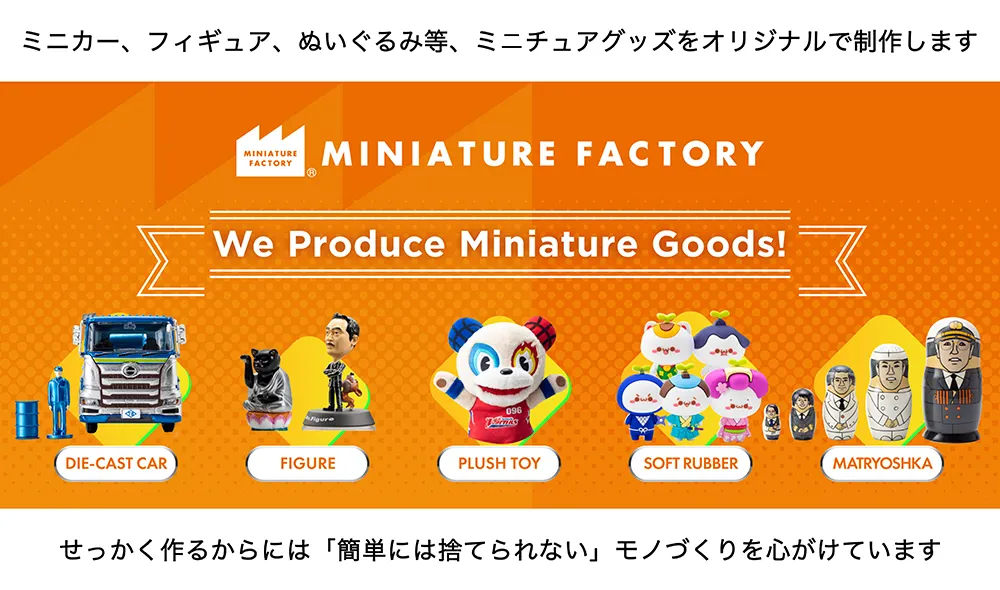 株式会社ミニチュアファクトリーは、2003年の創業以来、オリジナルミニチュアグッズの企画制作を主力事業として展開。ミニカー、フィギュア、ぬいぐるみなど、企業の周年記念品やコンサートグッズをOEMで受託制作し、「簡単には捨てられない」モノづくりをモットーとした高品質な製品づくりで信頼を築いています。
