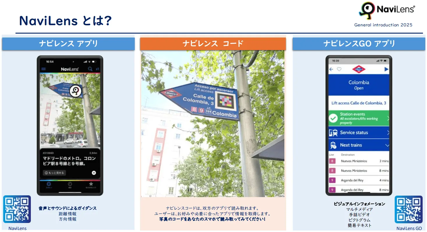 ナビレンス・ナビレンスGOは、①ナビレンスコード(拡張現実カラーコード)、②ナビレンスアプリ(視覚障害者向け)、③ナビレンスGOアプリ(晴眼者&外国人向け)、④管理プラットフォーム、で構成される、外国人+視覚障害者向け歩行移動の情報支援ソリューションです。