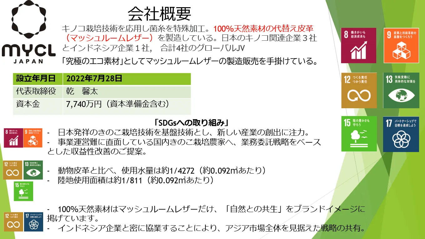 製造方法の提携もしくはKINOLI製造方法・きのこ栽培技術・鞣し方法と御社の技術・知見を掛け合わせた共同研究開発等も積極的に行っていきたいと考えており環境意識の高い企業様と共により良いものを創造していきたいとも思っております。