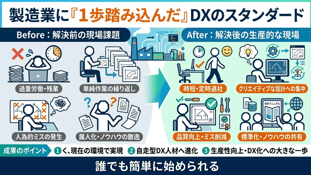 設計・製造現場の進まない「生産性向上」「DX化」「業務改善」、そして「人手不足」「人材教育」などの問題をまとめて解決したいです。