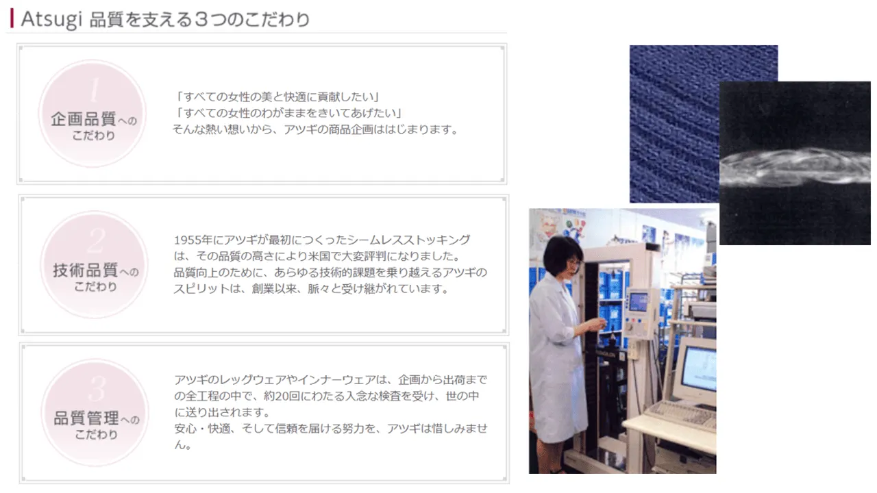 アツギ株式会社は、ストッキング・タイツなどのレッグウェア製造・販売を中核事業とする企業です。