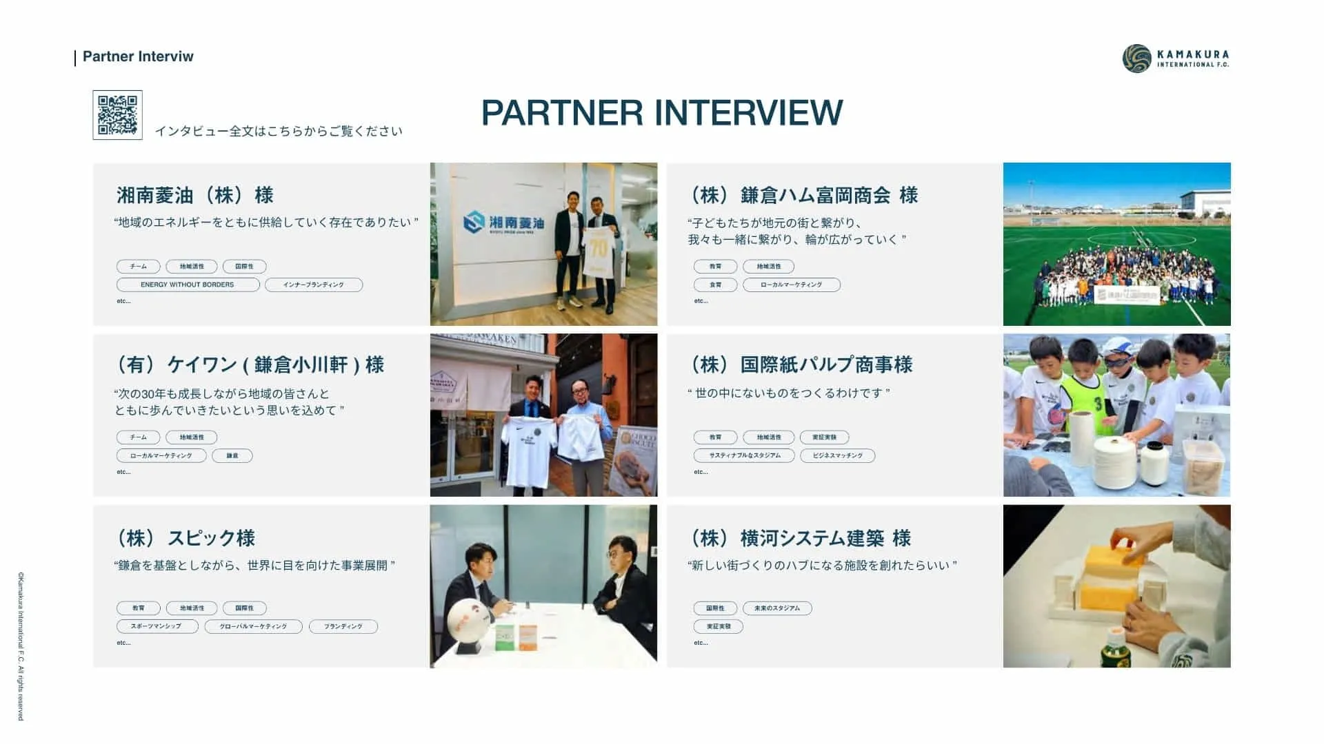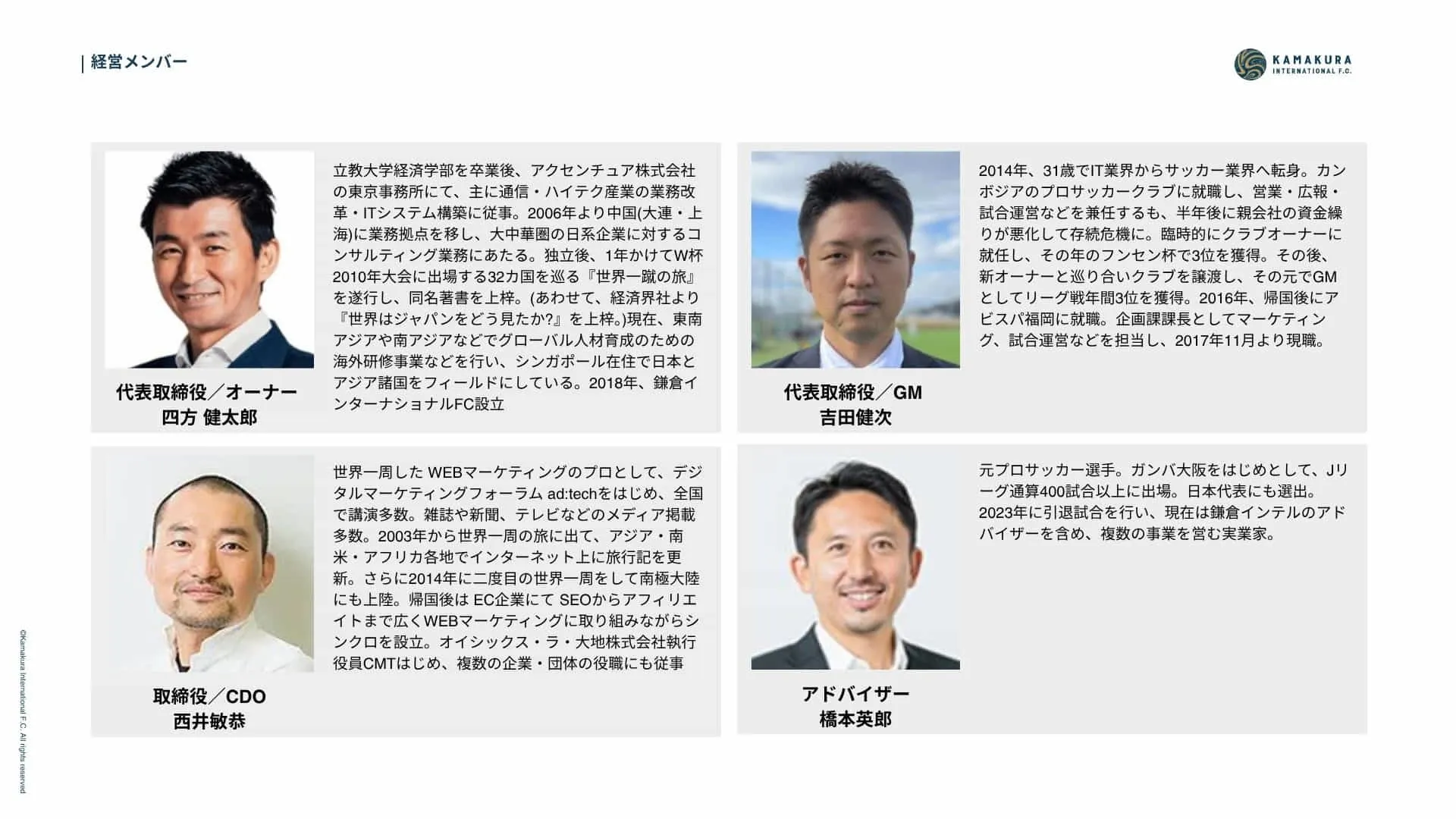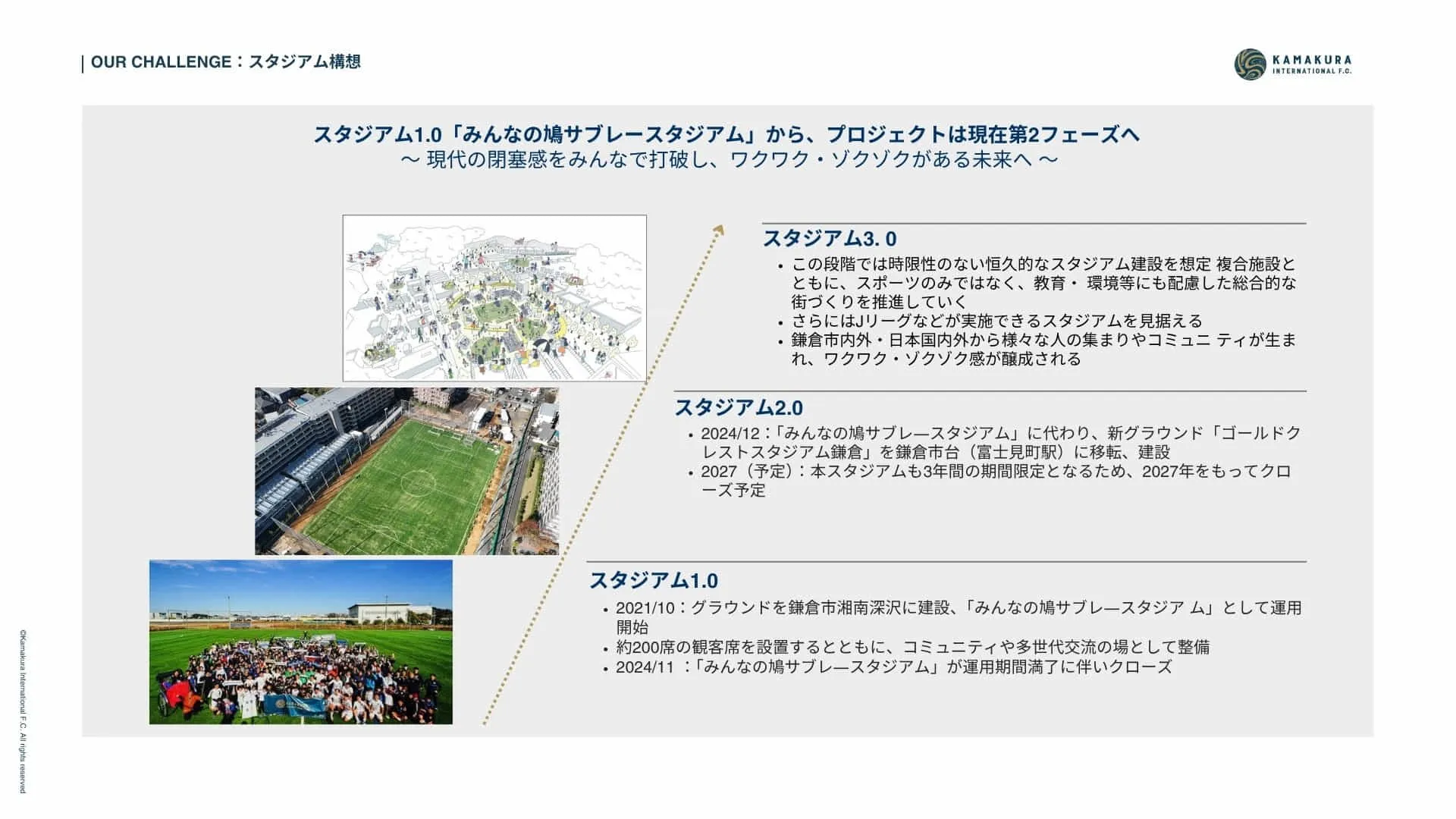 - 鎌倉を拠点にJリーグ参入を目指す国際型サッカークラブです。スタジアムを起点に、教育・健康・国際交流など地域と共創する“まちづくり”を推進。Web3やトークン等も活用し、社会実装や実証実験のフィールドとして企業との共創に取り組んでいます。