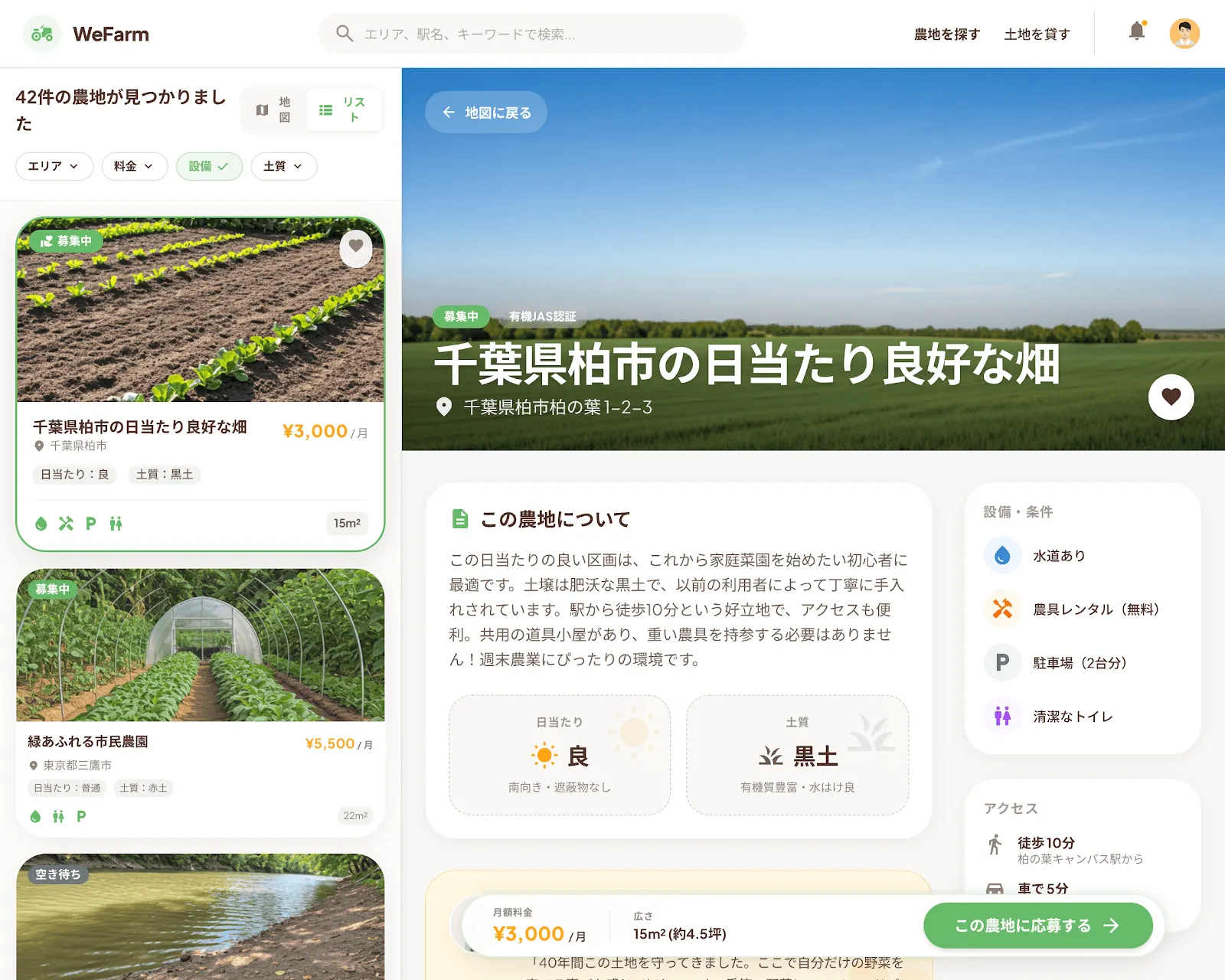 2. 複雑な「農地法」手続きを完全DX化(リーガルテック) 参入障壁となっていた「特定農地貸付法」などの複雑な行政申請プロセスを、当社のシステムが自動生成・管理します。 コンプライアンスリスクを排除し、誰でも適法かつスピーディーに農園開設ができるインフラを提供している点が、他社にはない最大の競合優位性です。