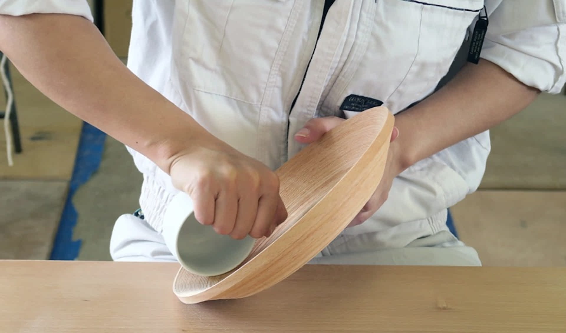 世界自然遺産白神山地をはじめ青森県にはブナの木が豊富にありますが、ブナは水分量が多く木工品や建材利用に不向きなため、有効活用されず戦後は大量に伐採されてきました。豊富にあるブナの高付加価値化を目的に1956年に開発されたブナコの製法は、薄板に加工したブナ材を細長いテープ状に裁断し、コイルのように巻き重ね、湯飲み茶わんを道具として使い押し出しずらしながら成型する独自の技術です。水分が多いというブナの弱点を克服するだけではなく、ロクロ挽き等の製法と比較し少ない木材資源で加工できます。