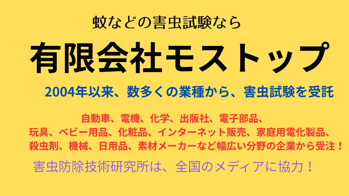 - 蚊、ゴキブリ、ユスリカ、チョウバエ、カメムシ、トコジラミなどの衛生害虫、不快害虫を用いた効果確認試験の実施。忌避、誘引、殺虫試験の実施。害虫を用いた商品試験実施、報告書、データ、動画の提供。各種メディアの監修。害虫の調査、駆除。