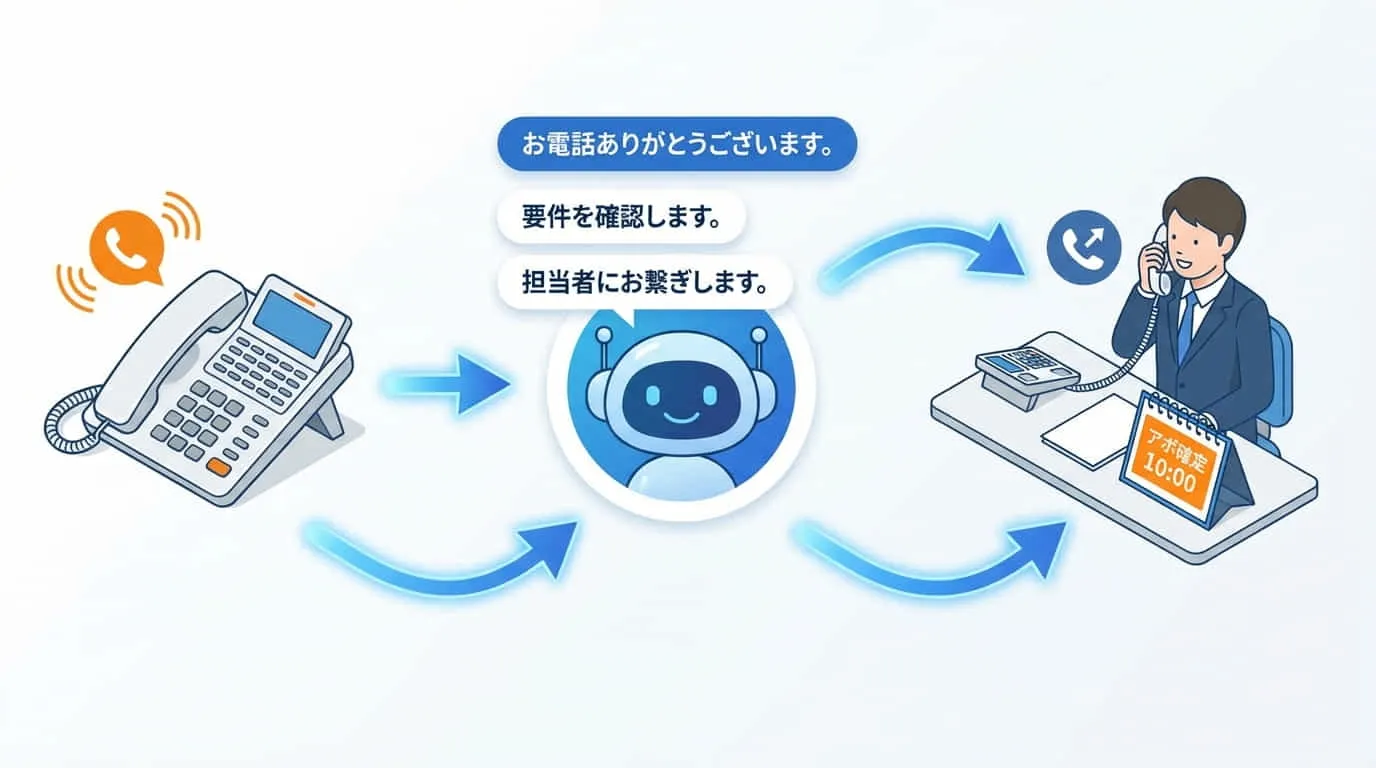 ミッション:受付→要件整理→担当接続→アポ確定の全工程を自動化し、電話の取りこぼしと引継ぎ工数をゼロにする。