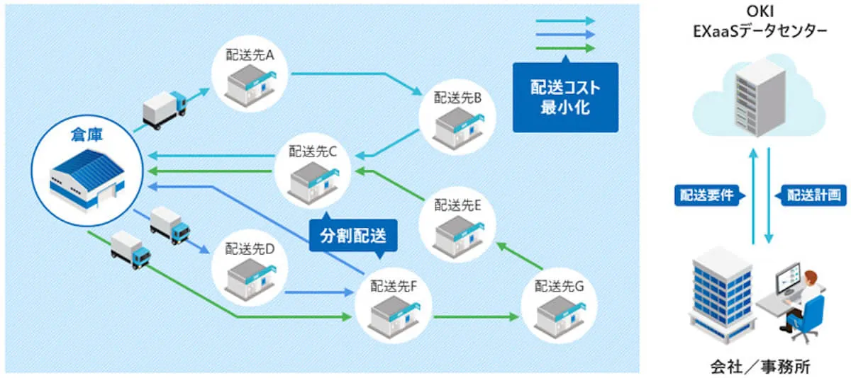 ▲配送計画最適化サービス「LocoMoses」は、配送先位置、配送車両の積載量・運行便数、荷物量・納品時刻等の配送要件に基づき、稼働・リソースの節減を可能とする最適な配送計画を提供する。(画像出典:OKIホームページ)