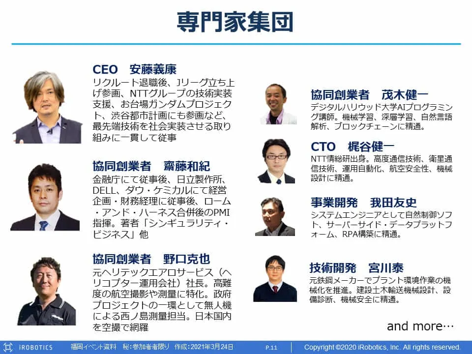 また、弊社は課題に即して一気通貫で支援をするためにビジネス・テクノロジー・ロボットオペレーションの分野からさまざまな専門家たちが集まっている集団となっております。ドローンだけに寄らずAI・ブロックチェーン・画像技術を生かしてどのように課題解決をしていくか一丸となって考えられる体制を構築しております。