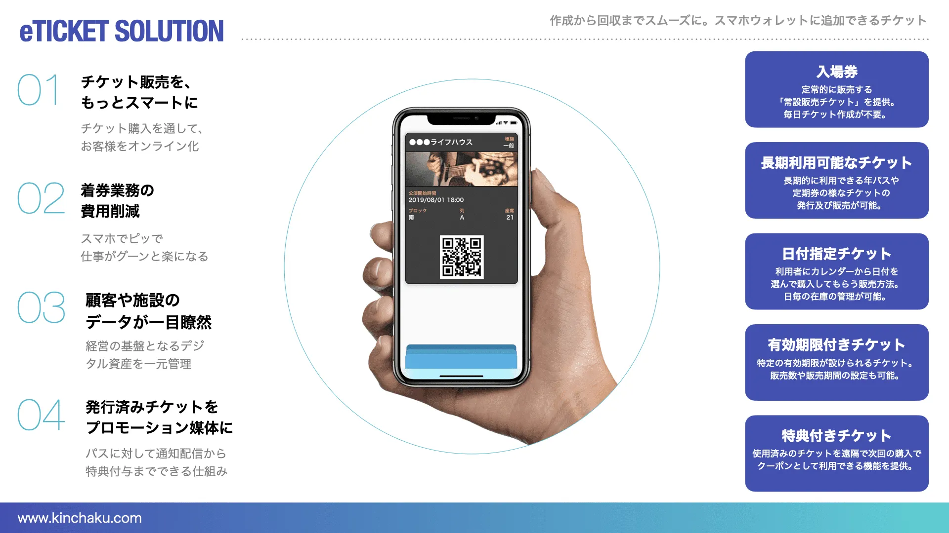 ▲KINCHAKUは、一般的なイベント入場チケットに加え、年間パスポート、時間指定、回数券、クーポン券、引換券など、多彩なチケットに対応している(画像出典:プレスリリース)