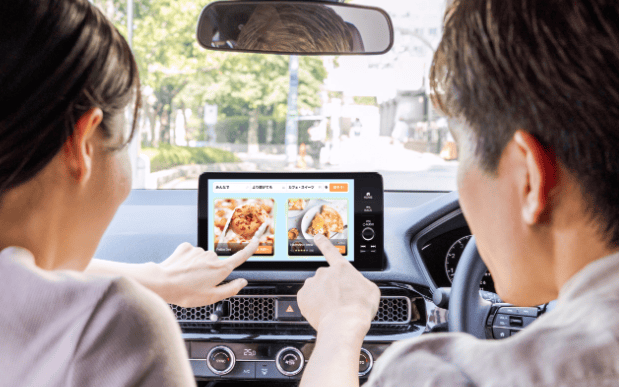→EatMoでの予約/注文/決済と、車載ナビ・車両AIを連携。来店予測時刻に基づき、駐車場誘導や店舗到着通知を自動化